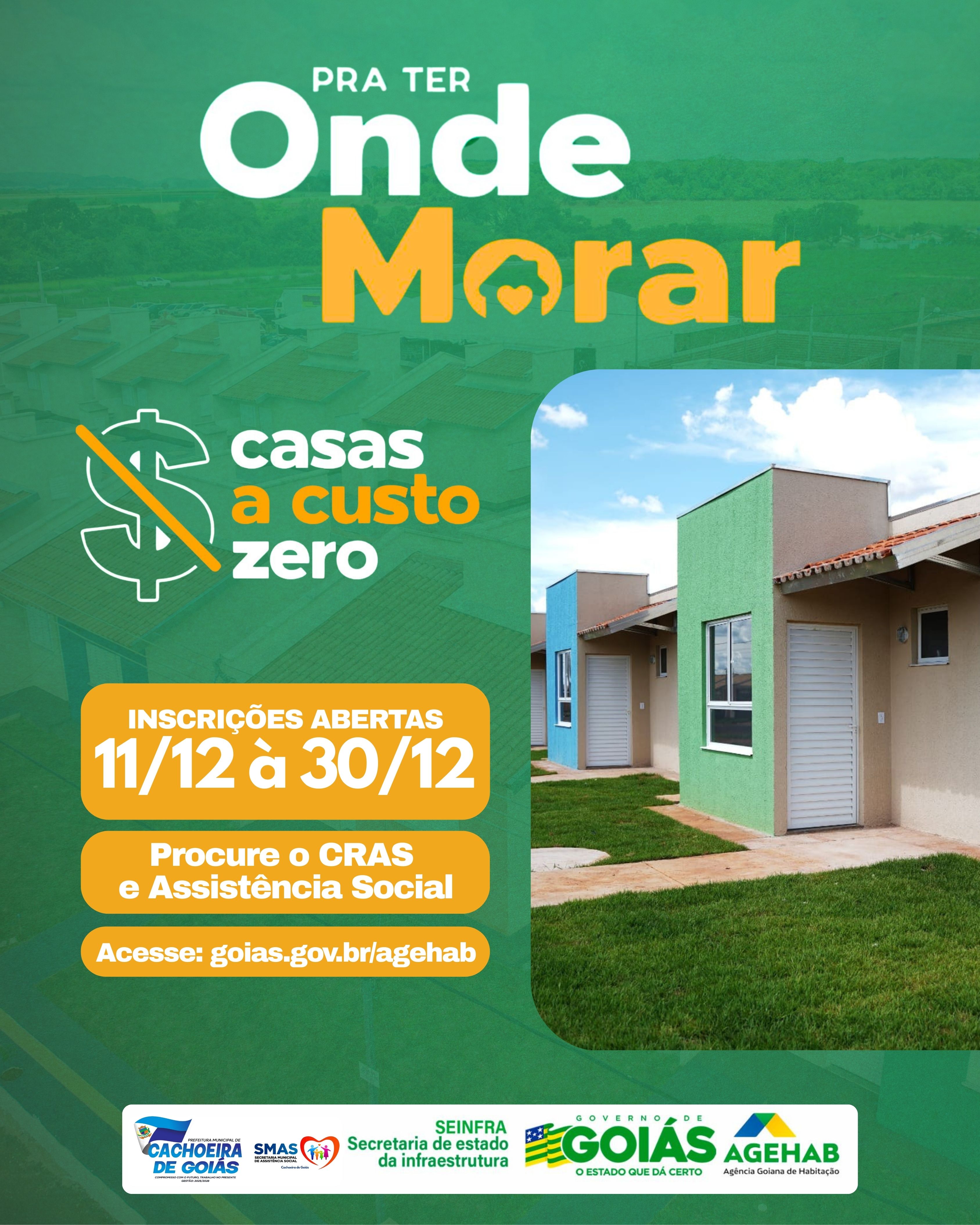 A Secretaria de Assistência Social, juntamente com o CRAS, informa que a partir de segunda-feira, 15/12/2025, estará à disposição de toda a população de Cachoeira de Goiás para esclarecer dúvidas e realizar as inscrições no site da AGEHAB, sem custo algum.